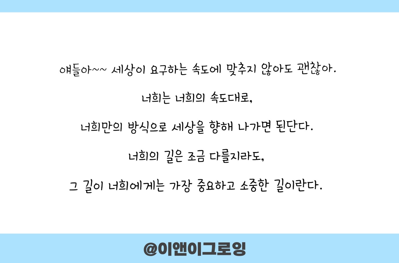 “얘들아~~ 세상이 요구하는 속도에 맞추지 않아도 괜찮아.” 한 줄의 문장이 이렇게 마음을 울릴 수 있구나 싶었거든요~