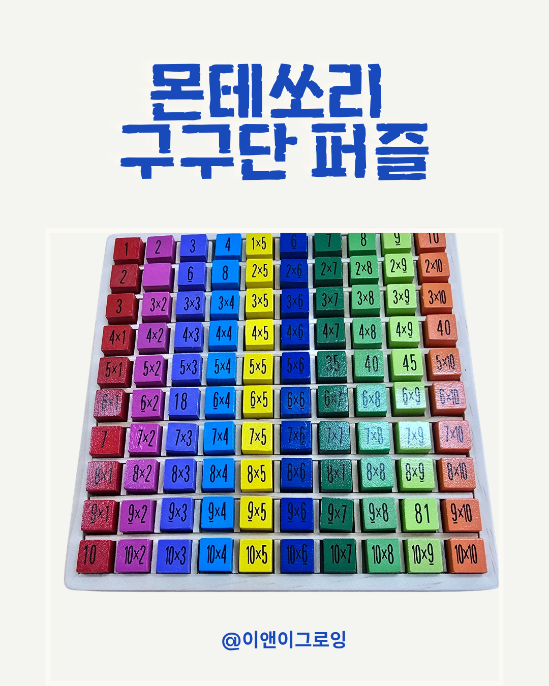 이 것 저 것 찾아보던 중 몬테소리 구구단 퍼즐을 발견하게 되었는데요, 묶음의 원리로 곱셈을 이해하게 하는 데는 한계가 있지만 구구단을 놀이처럼 쉽게 다뤄볼 수 있는 교구로 추천하는 바입니다.